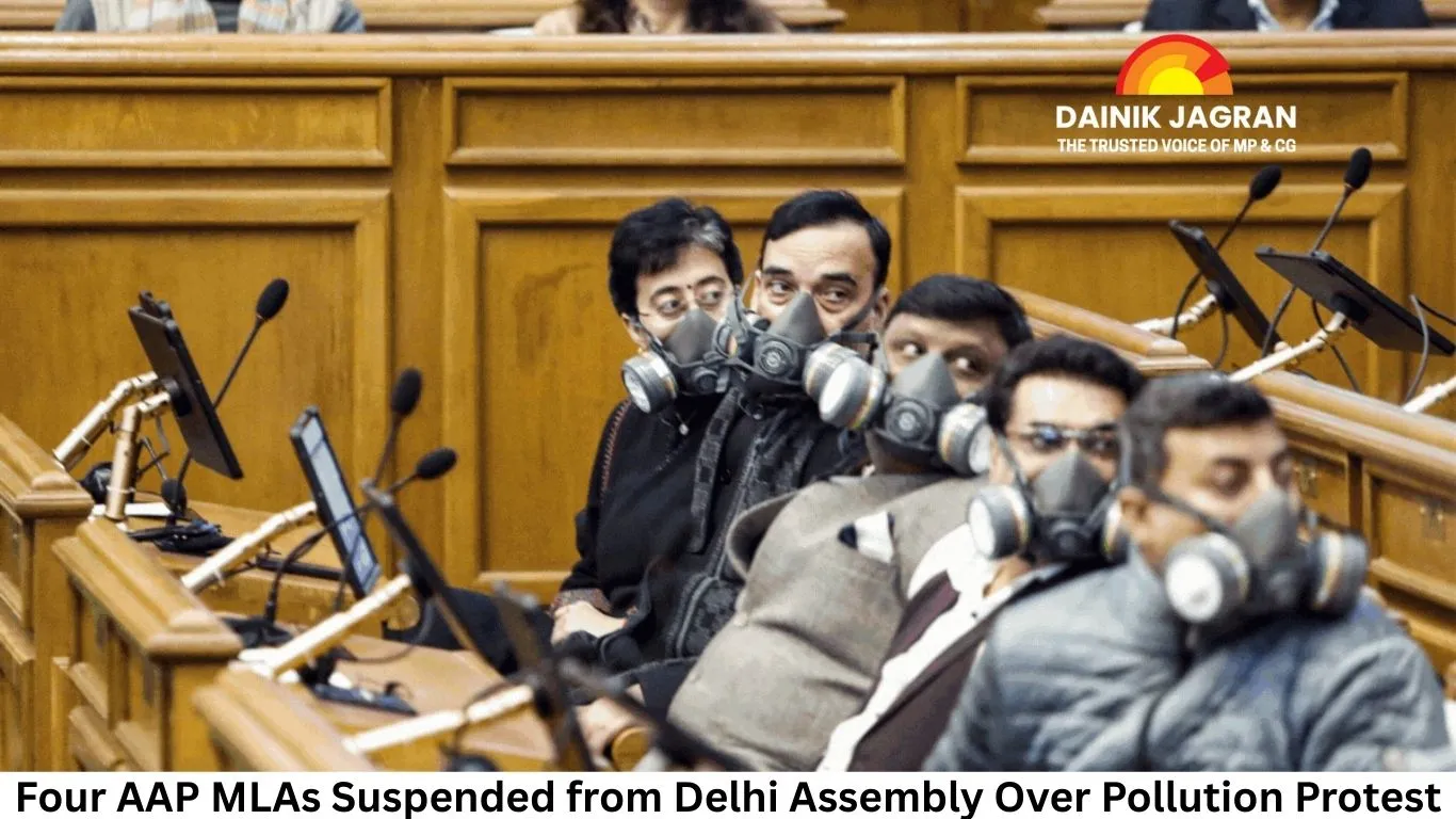 Four Aam Aadmi Party (AAP) MLAs were suspended from the Delhi Assembly for three days on Monday after creating a ruckus during Lieutenant Governor VK Saxena’s address on the first day of the Winter Session. The suspension followed repeated disruptions by the MLAs, who were protesting against the rising air pollution in the national capital.