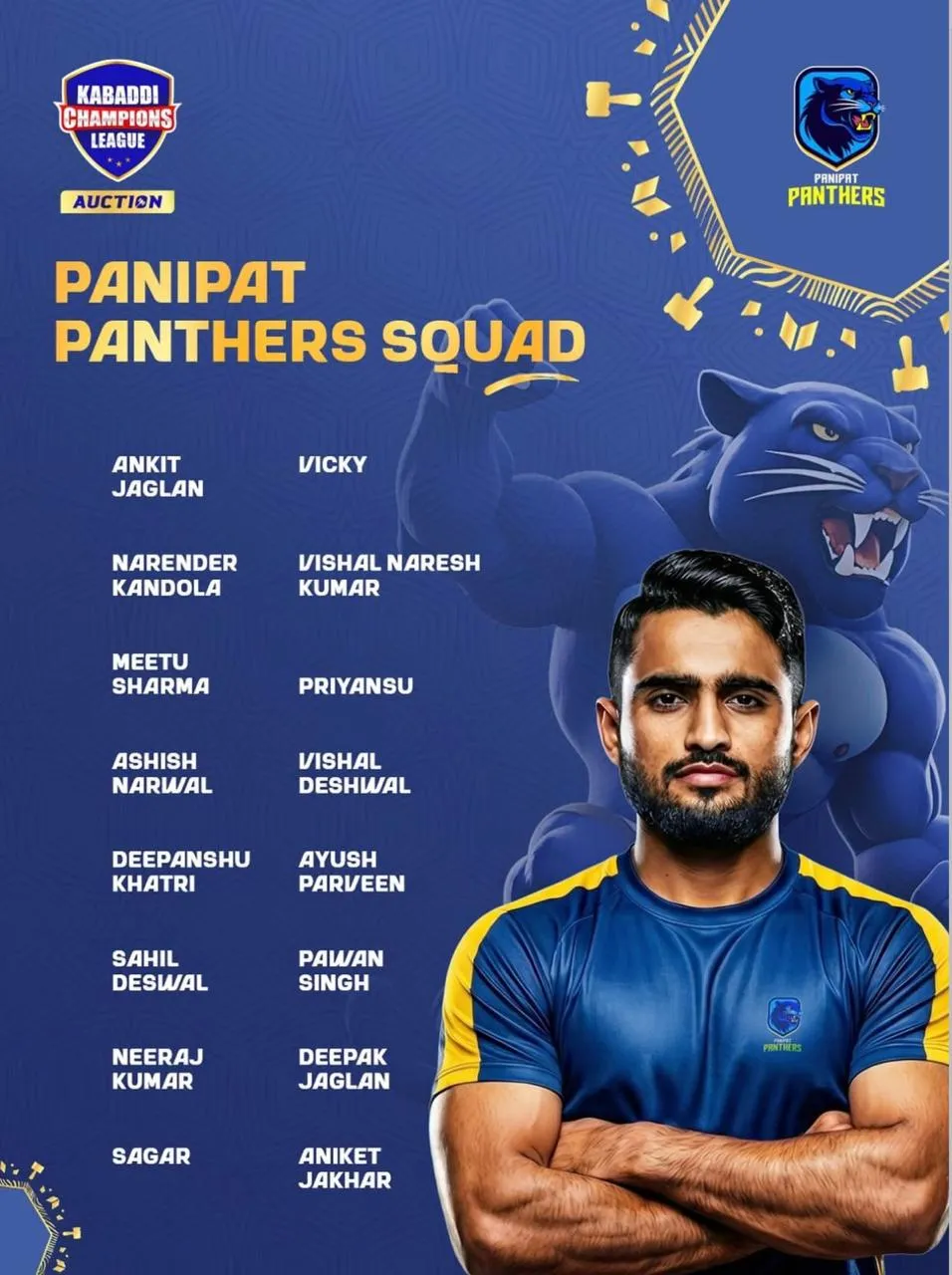 The Panthers have also invested smartly in depth and balance, bringing in players like Deepanshu Khatri and Ashish Narwal at Rs. 4.8 lakhs each, while a strong supporting cast including Sahil Deswal, Neeraj Kumar, Sagar, Vicky, and emerging talents such as Vishal N Kumar and Priyanshu completes a squad built for intensity and endurance.