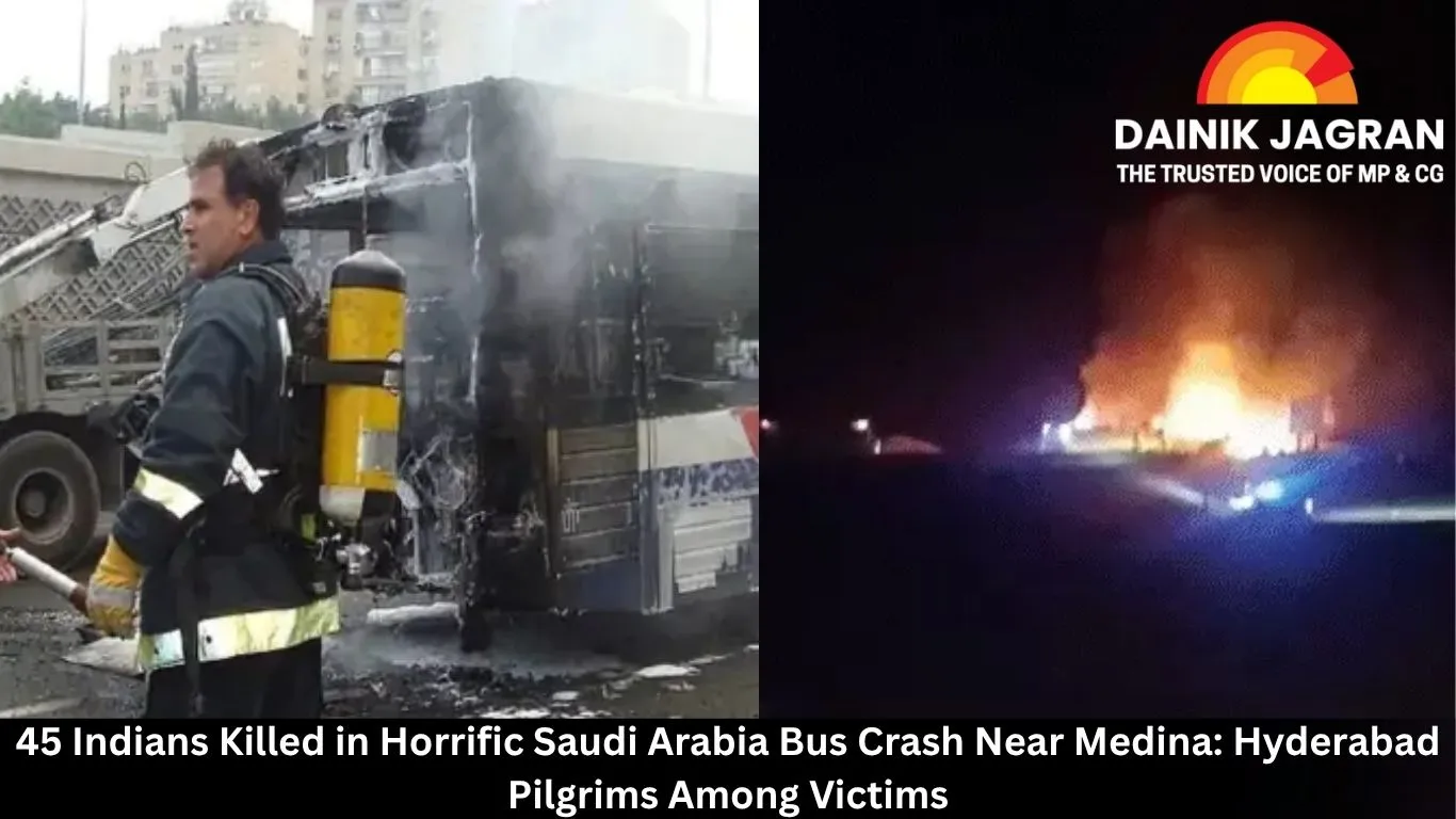 In one of the deadliest road accidents involving Indian pilgrims in recent years, 45 Indian nationals, including 18 women and 10 children, were killed when their bus collided with a diesel tanker and burst into flames near Medina, Saudi Arabia, late Sunday night.