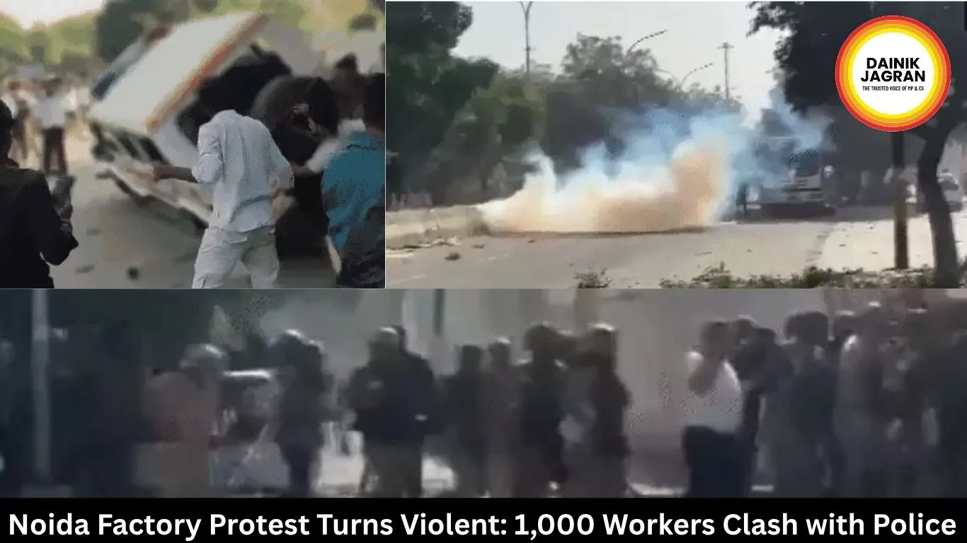 Violence erupted in Noida Phase-2 as over 1,000 factory workers demanding salary hikes torched vehicles and pelted stones. Police deployed tear gas to control the situation.