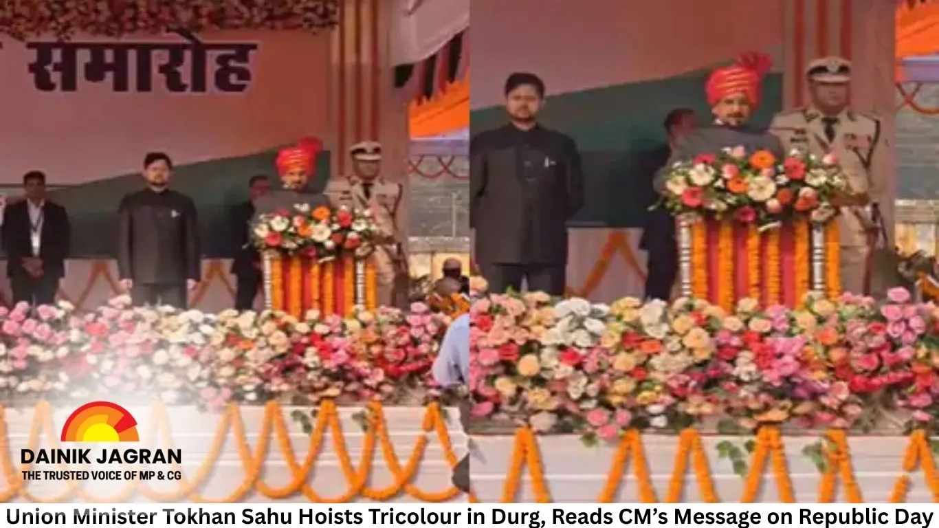 Union Minister of State for Housing and Urban Affairs Tokhan Sahu unfurled the national flag at Ravi Shankar Stadium in Durg on the occasion of the 77th Republic Day, reviewed the ceremonial parade, and read out the Chief Minister’s message highlighting the state’s development priorities and welfare agenda.