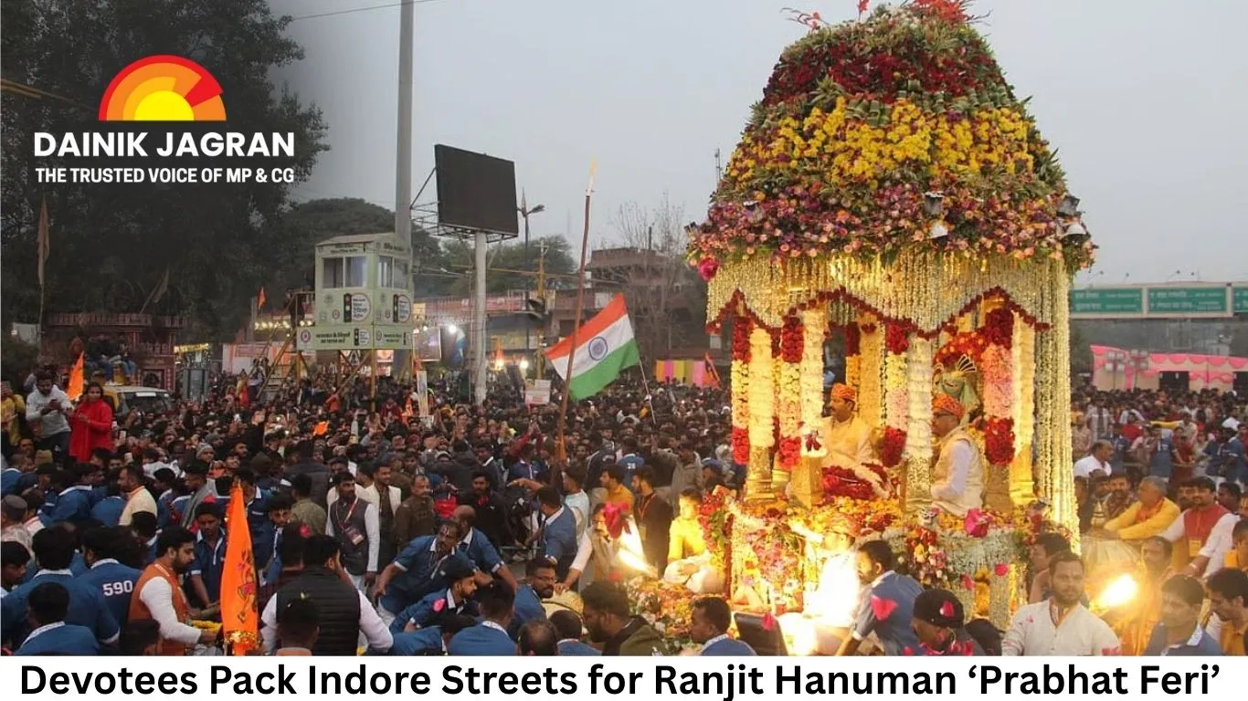Indore witnessed an overwhelming turnout of devotees on Ranjit Ashtami on Thursday as thousands joined the annual Prabhat Feri from the Ranjit Hanuman Temple, braving biting early-morning cold to participate in the traditional procession. The event, which began at 5 a.m., moved slowly due to the heavy crowd, covering barely 2.3 km in four hours along a route planned through Dravid Nagar, Mahu Naka, Dussehra Maidan, and Annapurna Mandir.