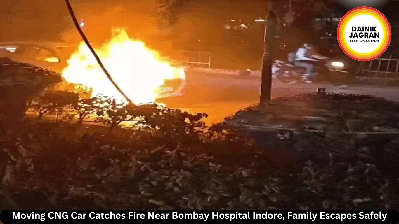 Indore car fire near Bombay Hospital as CNG short circuit suspected, family escapes safely without injuries.
