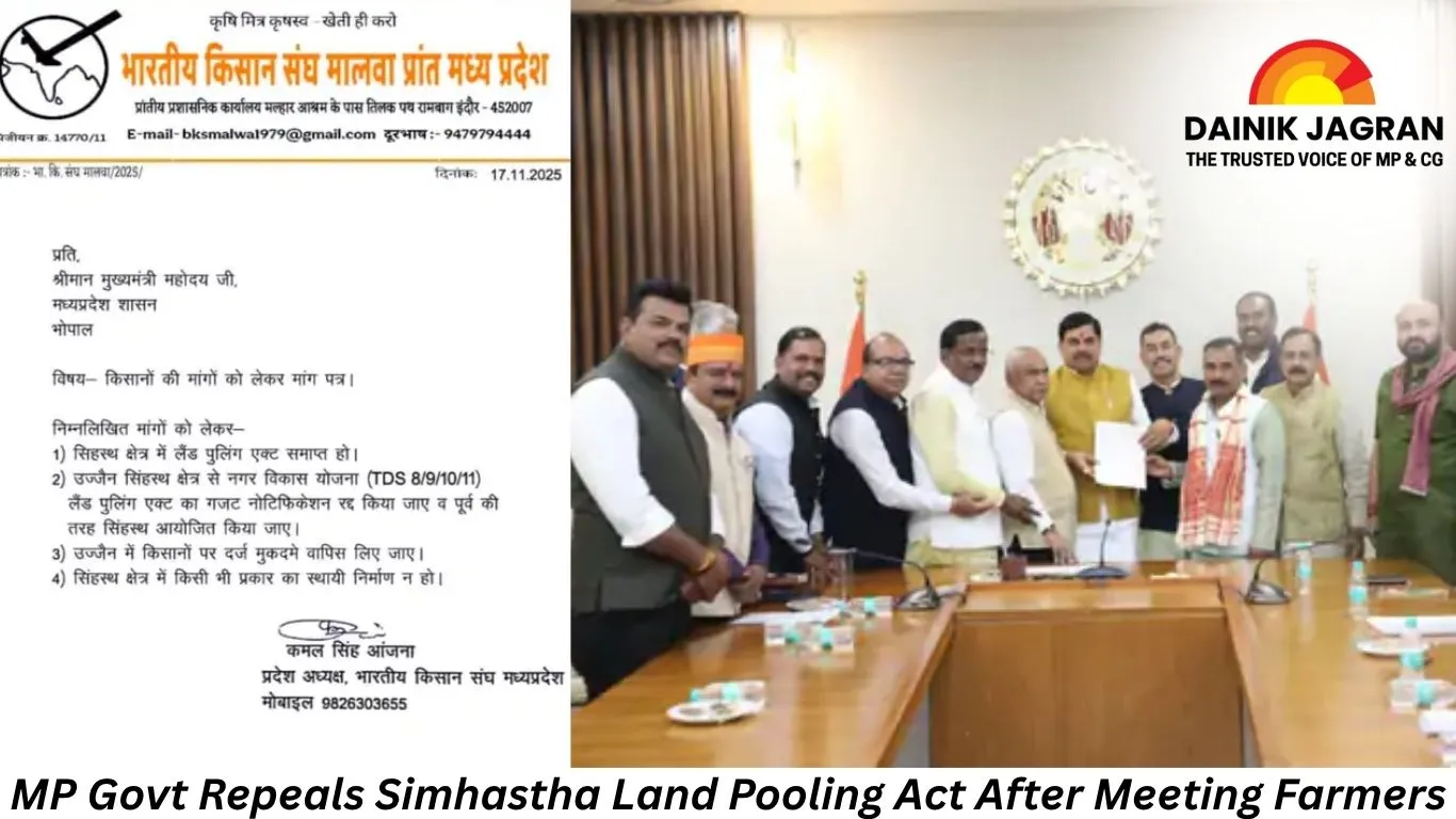 The Madhya Pradesh government on Monday revoked the Simhastha Land Pooling Act in Ujjain, hours ahead of a major agitation planned by the Bharatiya Kisan Sangh. The decision came following direct talks between Chief Minister Dr. Mohan Yadav and a delegation of farmers, leading to the withdrawal of the “Dera Dalo, Ghera Dalo” protest scheduled for November 18.